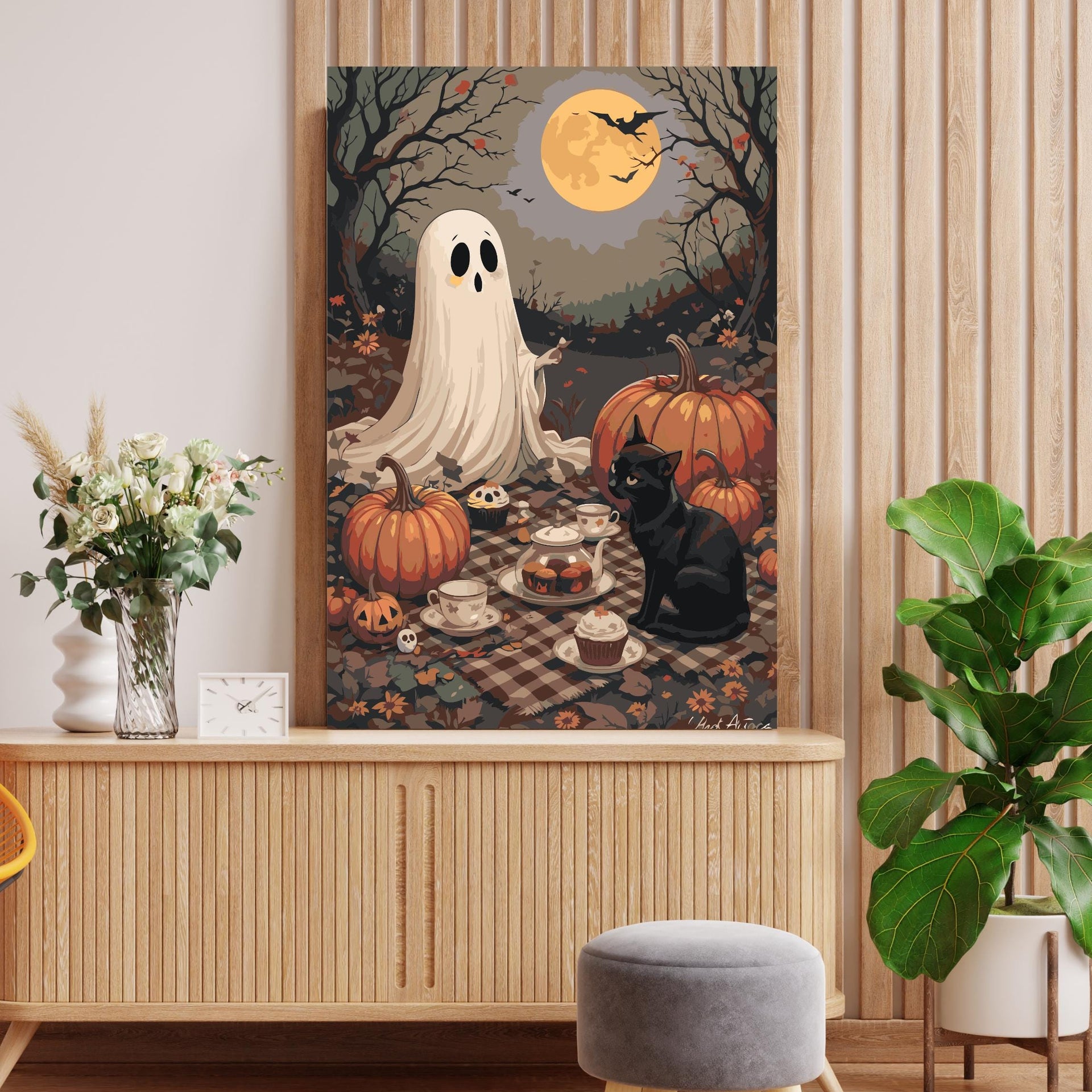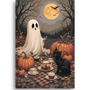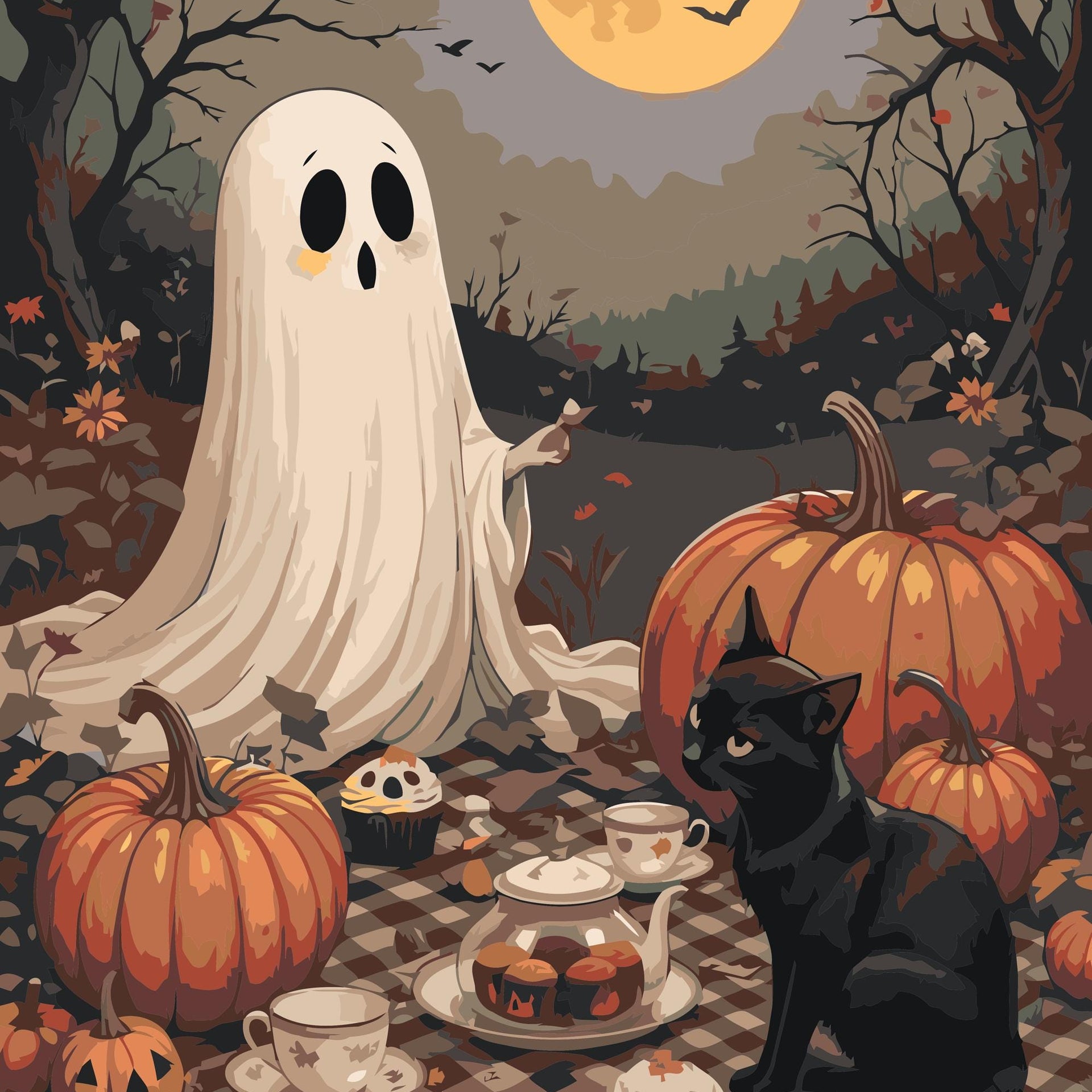Ghost and Black Cat Halloween Paint By Numbers Kit | Pumpkin Tea Party DIY Canvas Art | Spooky Autumn Painting for Adults