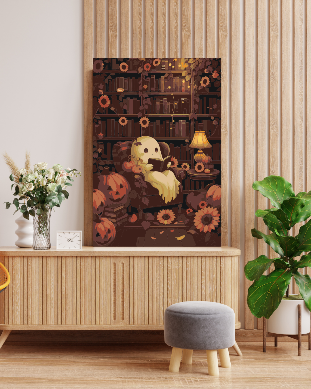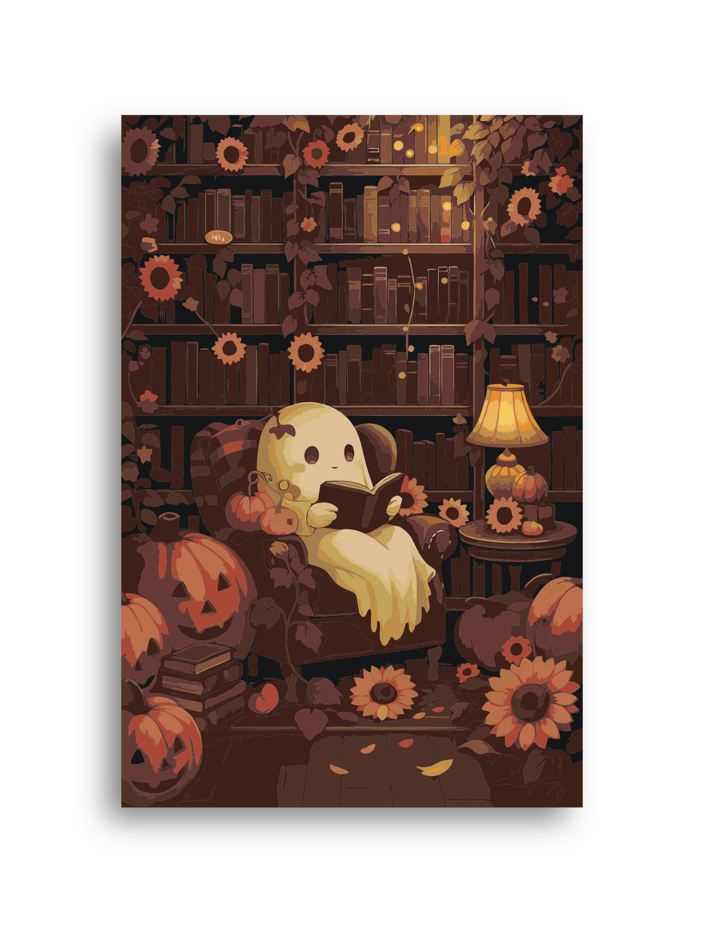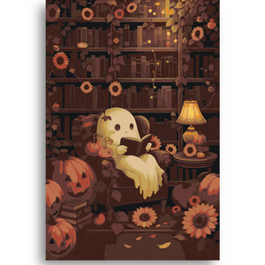 Ghost Reading in Library Paint By Numbers Kit: Spooky Halloween Pumpkin DIY Art for Adults